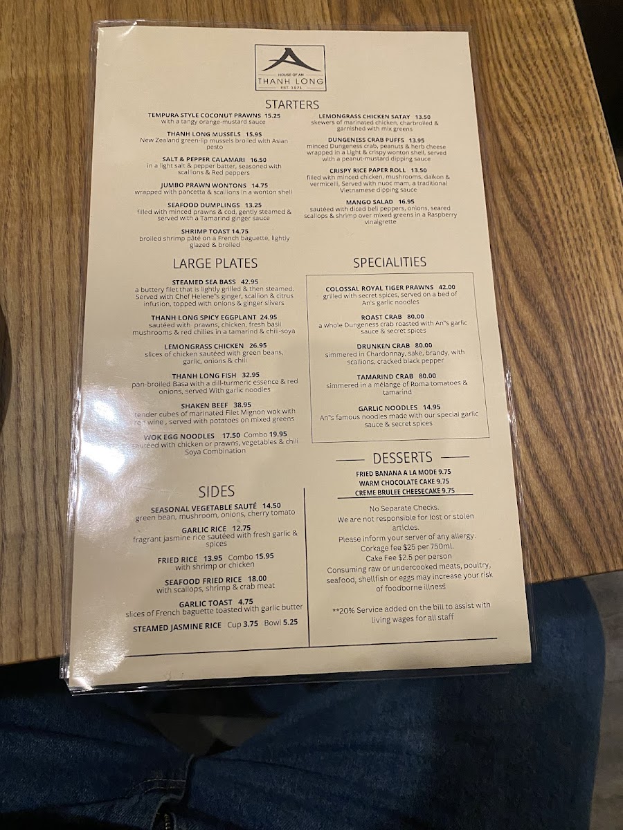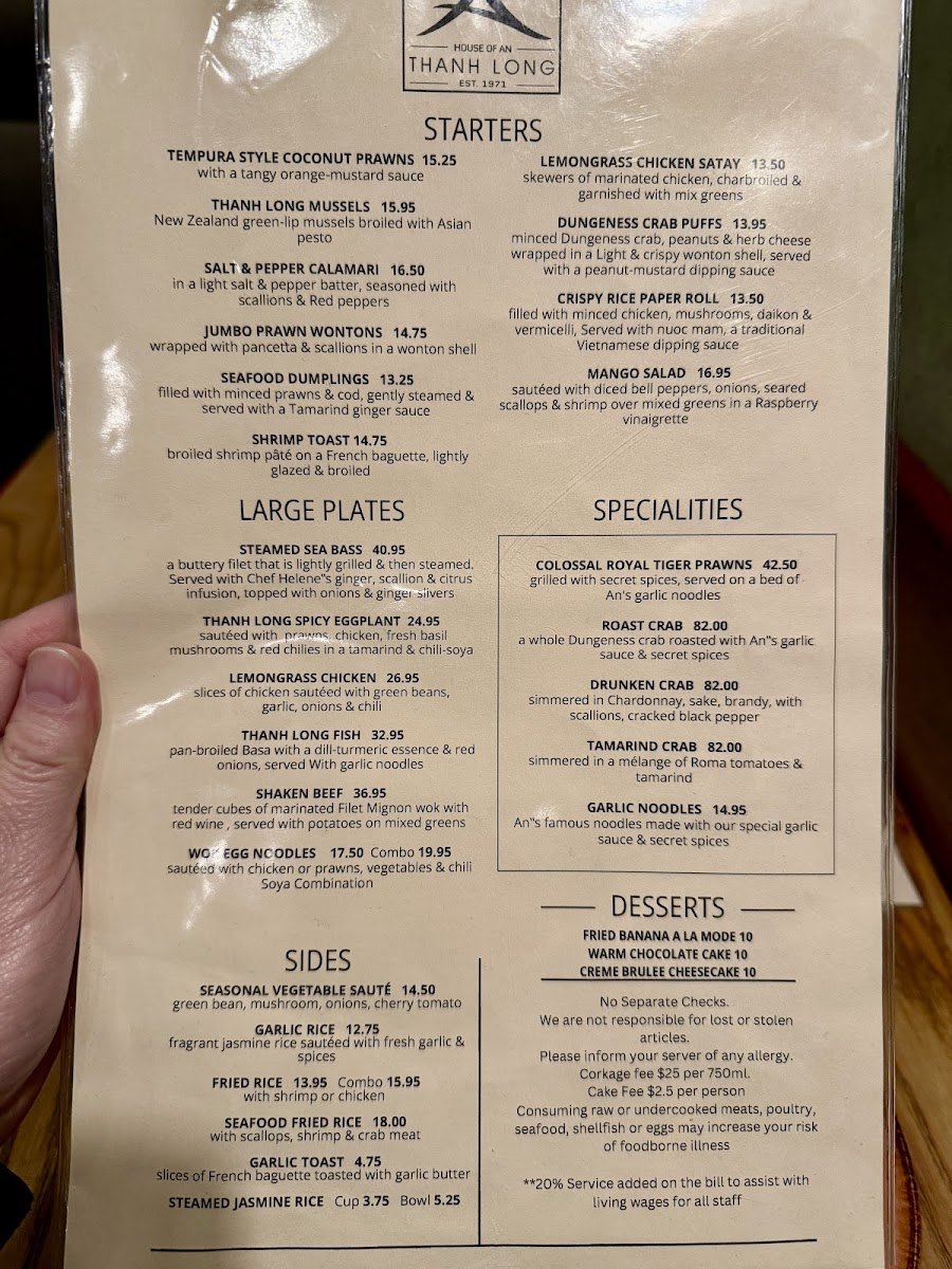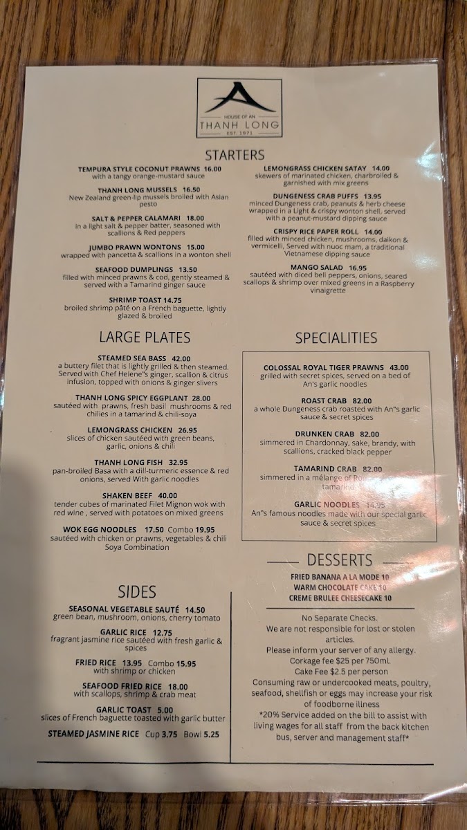 The Thanh Long Restaurant Menu offers a delightful variety of flavors that transport you straight to the heart of Vietnamese cuisine. Located at 4101 Judah St in San Francisco, this beloved spot brings fresh, high-quality ingredients to the table with every dish. Whether you're craving their famous crab dishes or a satisfying bowl of pho, you’ll find something to excite your taste buds. The menu is a perfect mix of traditional Vietnamese staples and house specials, all carefully crafted with bold flavors and authentic spices. With its warm ambiance and friendly service, Thanh Long is the perfect place for both a casual meal or a special night out. No matter what you choose, you're in for an unforgettable dining experience!